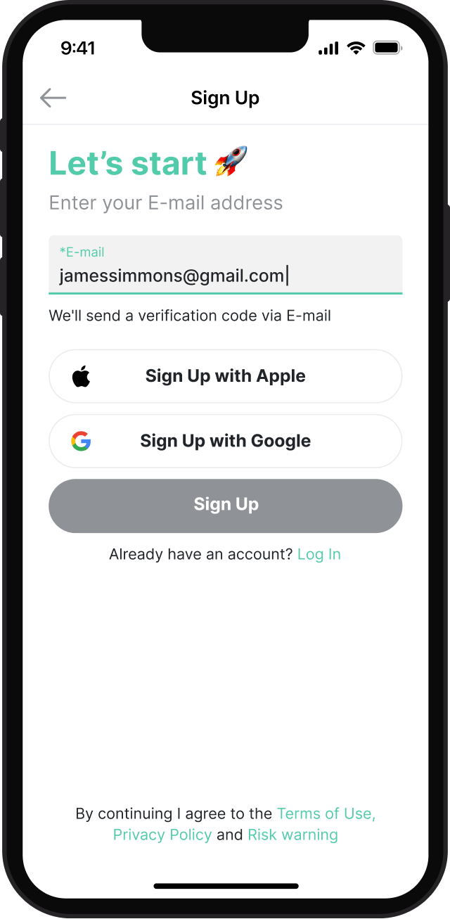 Use your Apple or Google account to speed up registration — just a few steps and you're in.